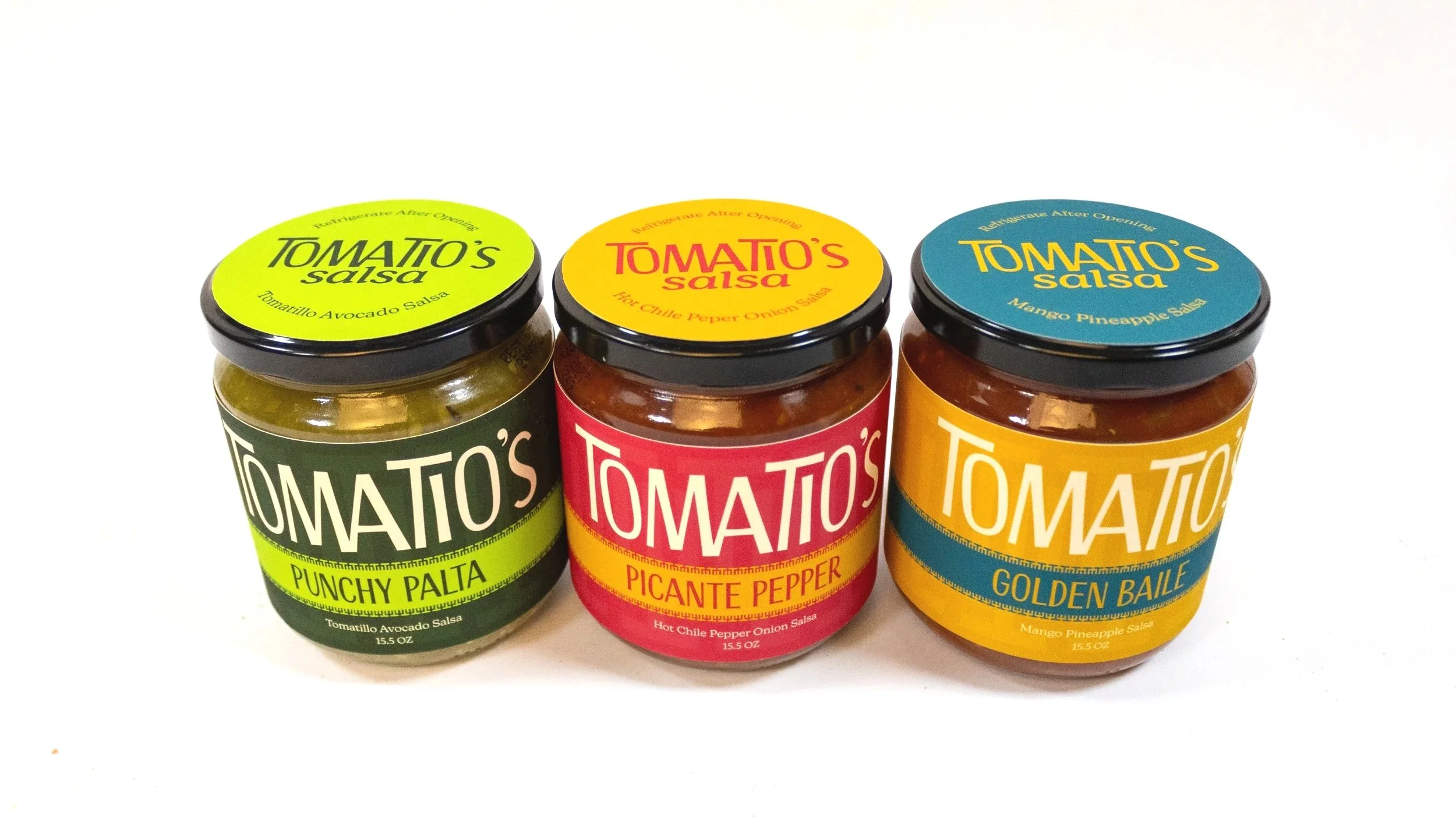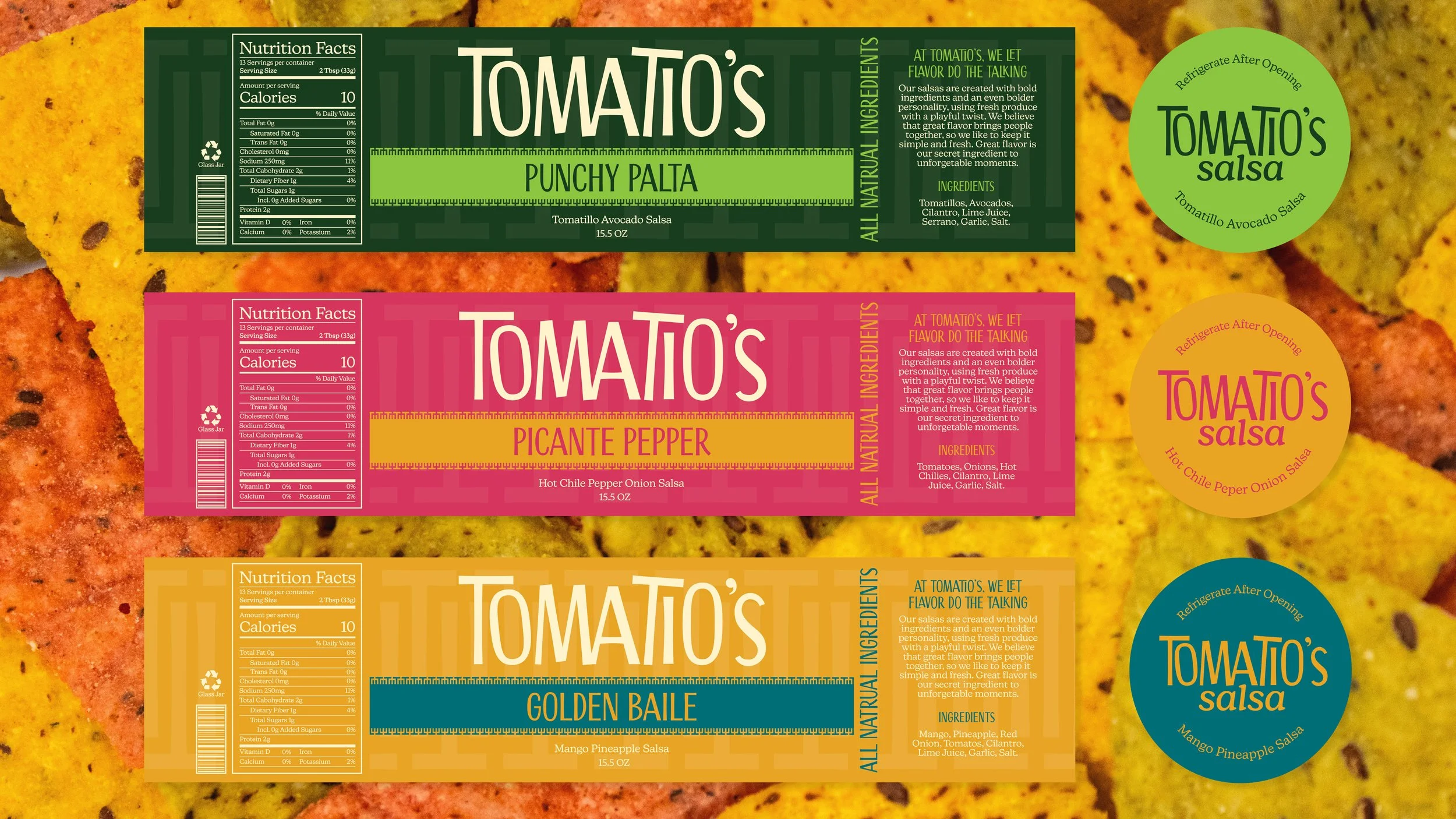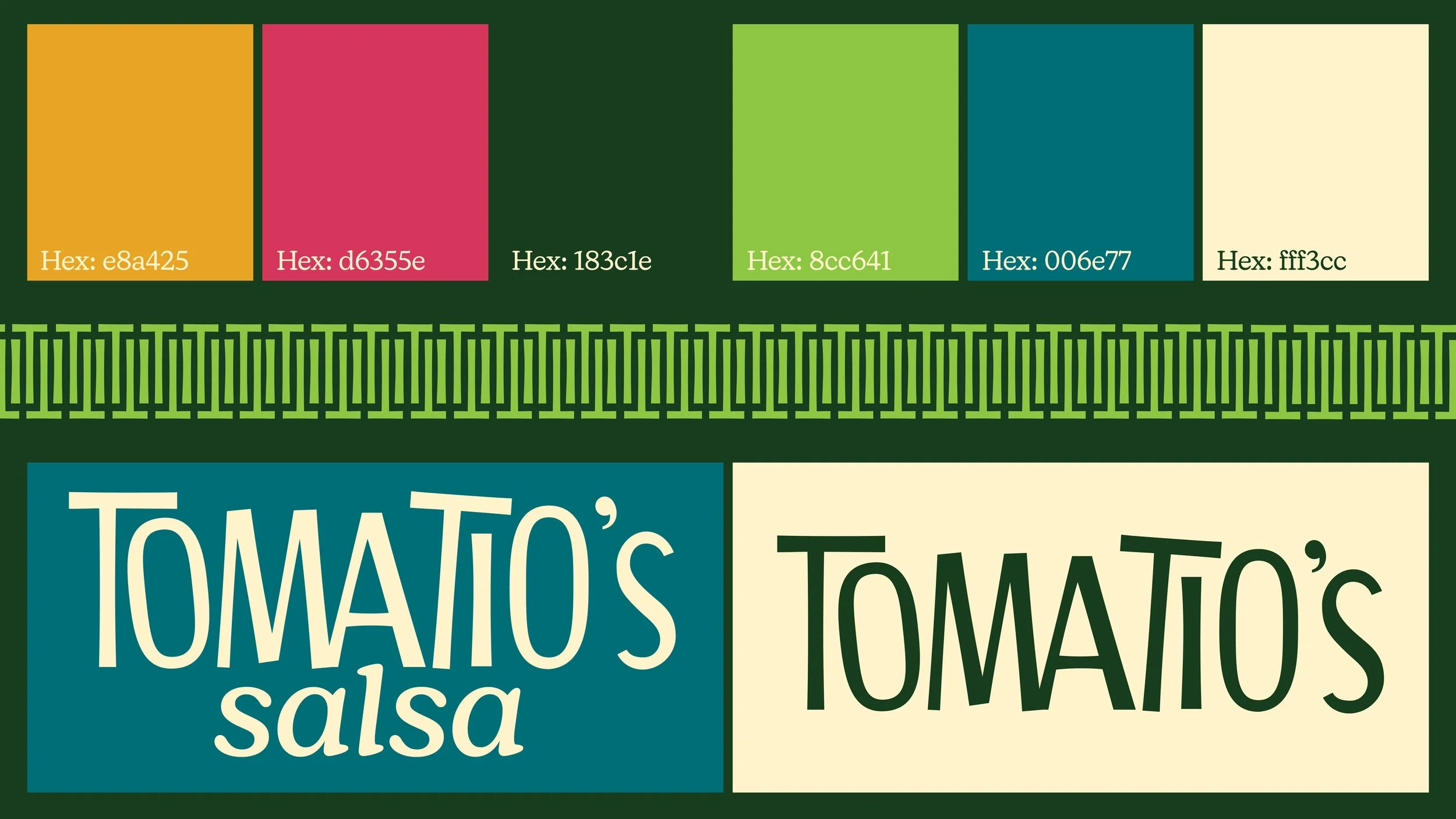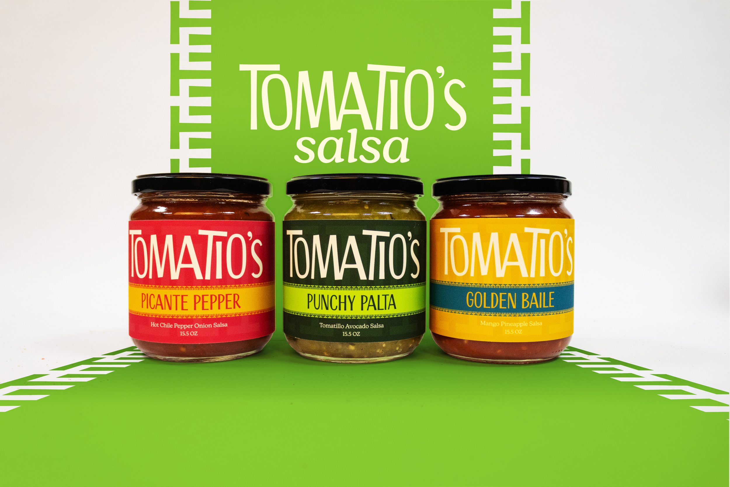 Tomatio’s Salsa is a playful brand rooted in both taste and community. The name combines “toma,” meaning “to take” and “tío” which evokes warmth, family, and shared meals. These two combine to create a brand name that sounds like tomatillo, a key ingredient that helps shape the brand with fresh flavor. Together, the name reflects the idea of grabbing a jar and enjoying bold flavors with others. Tomatio’s Salsa is made for adventurous, flavor-seeking people who enjoy flavorful combinations and sharing food in social settings. The brand embraces an energetic and inviting personality, focusing on vibrant flavors that bring people together through goodness.