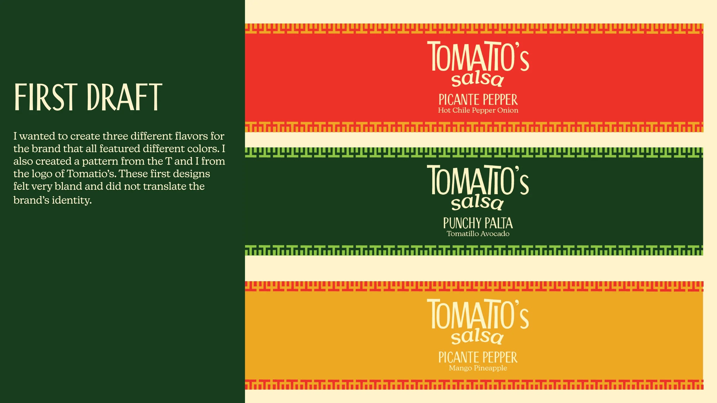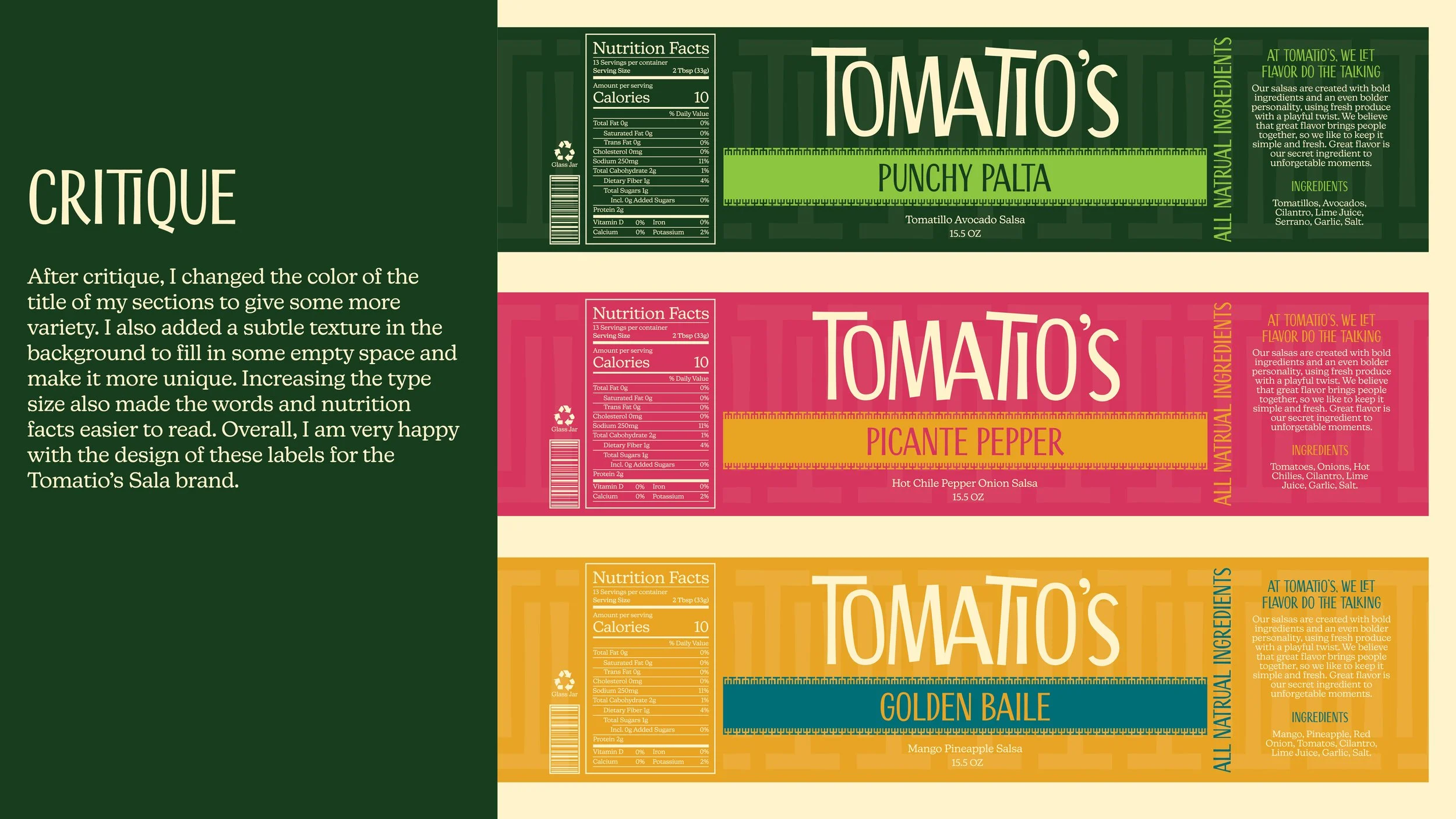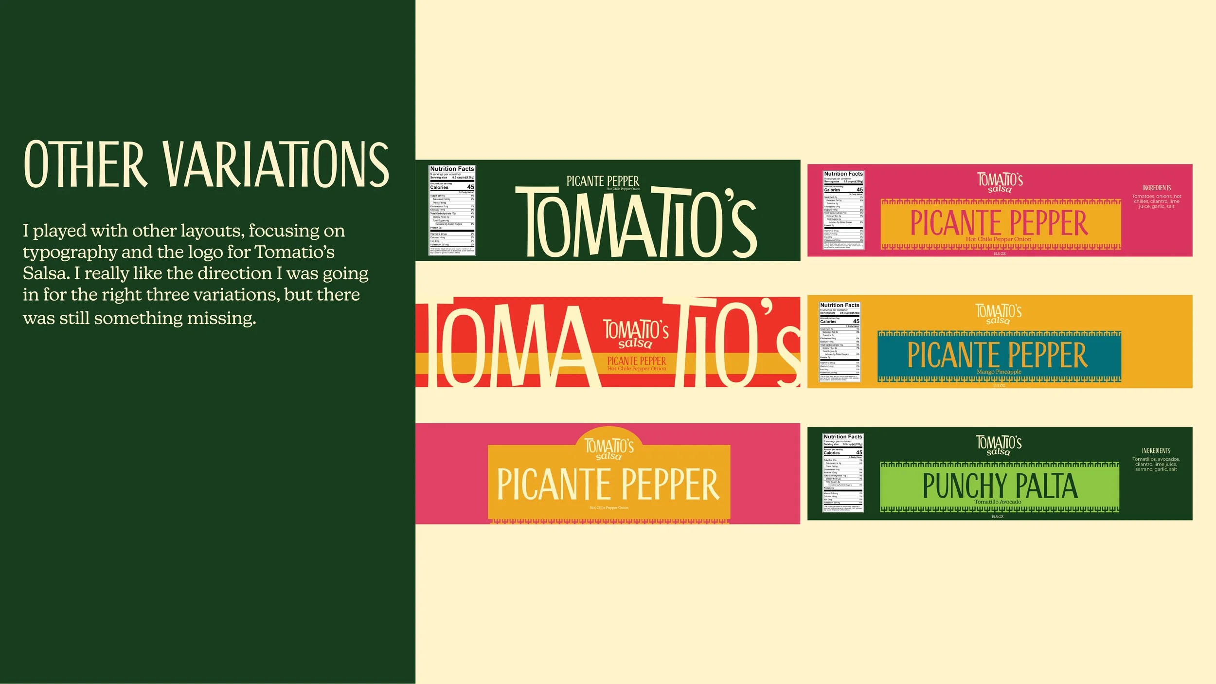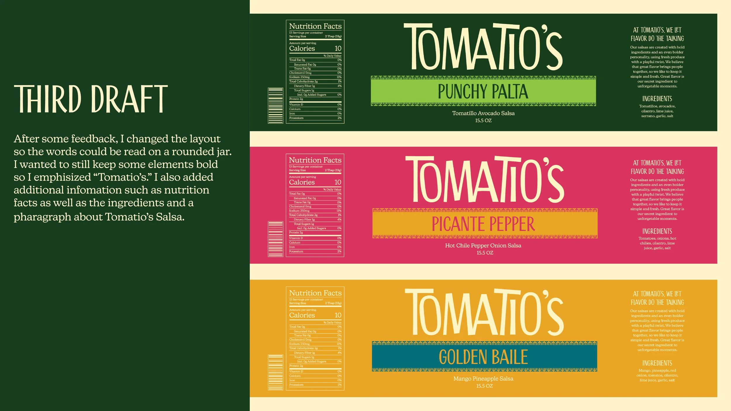 Tomatio’s Salsa is a playful brand rooted in both taste and community. The name combines “toma,” meaning “to take” and “tío” which evokes warmth, family, and shared meals. These two combine to create a brand name that sounds like tomatillo, a key ingredient that helps shape the brand with fresh flavor. Together, the name reflects the idea of grabbing a jar and enjoying bold flavors with others. Tomatio’s Salsa is made for adventurous, flavor-seeking people who enjoy flavorful combinations and sharing food in social settings. The brand embraces an energetic and inviting personality, focusing on vibrant flavors that bring people together through goodness.